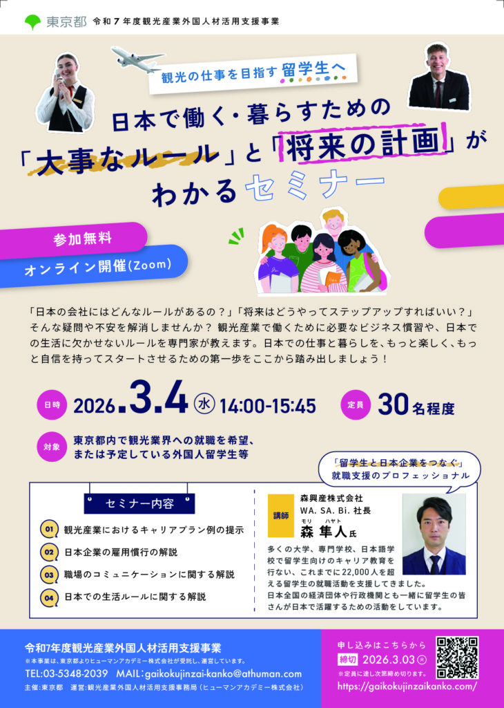 Curious about the rules in Japanese companies? Wondering how to advance your career? Get the answers you need! This seminar features experts who will teach you essential business customs and daily life rules in Japan. Take your first step toward a more enjoyable and confident life and career in Japan!