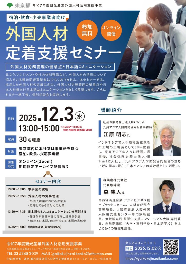 異文化マネジメントや社内体制整備など、外国人材の活用について悩んでいる観光関連事業者は少なくありません。本セミナーでは、採用した外国人材の定着に向け、外国人材労務管理の留意点や日本人社員向け日本語コミュニケーションを詳しく解説します。さらにセミナー終了後、個別相談会も実施します。