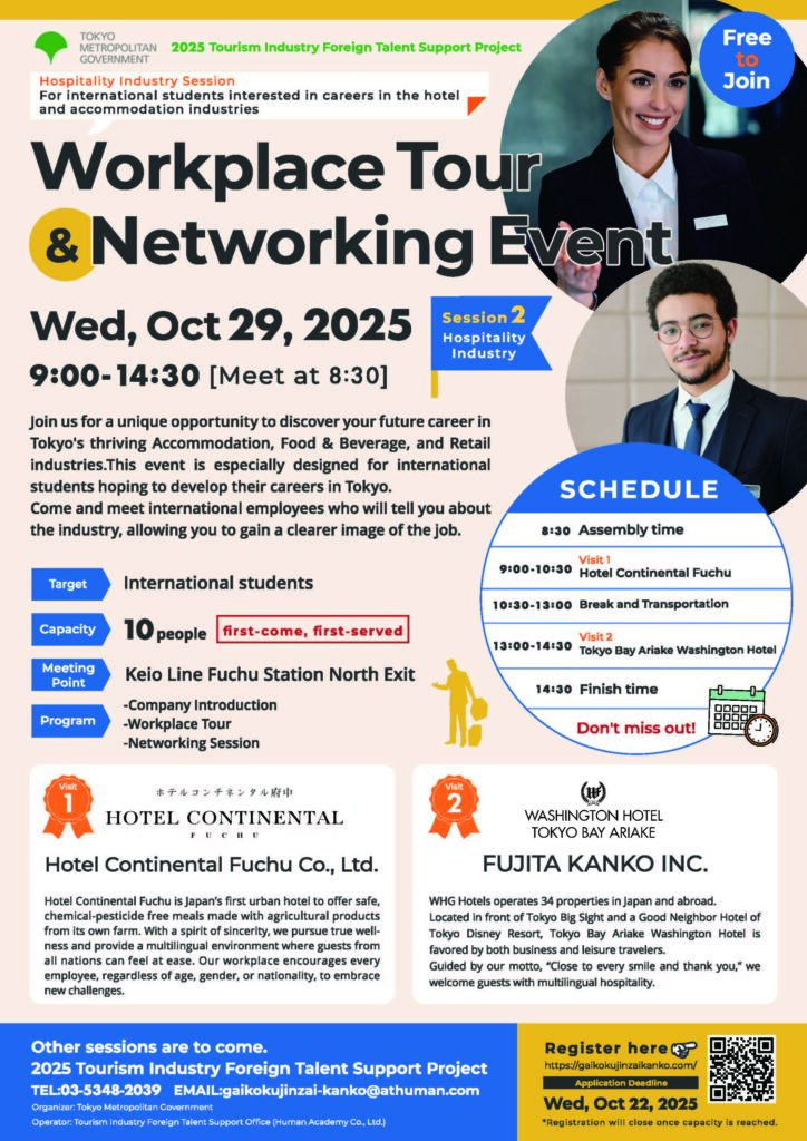 Join us for a unique opportunity to discover your future career in Tokyo’s thriving Accommodation, Food & Beverage, and Retail industries.This event is especially designed for international students hoping to develop their careers in Tokyo.